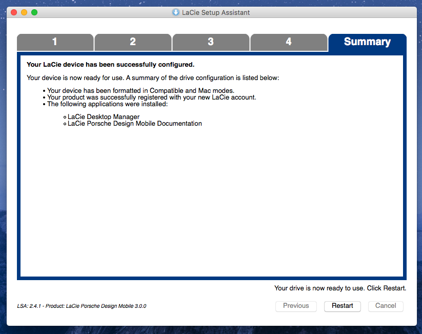 Once it has finish formatting and installation of that bundled Software, you will be landing on this summary page, you will just need to click “Restart” to reboot your Macbook and start using the drive.